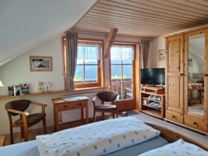 Unsere schöne und gemütliche Ferienwohnung „Hochgratblick“ mit Balkon ist mit einem Wohn-Schlafraum und einer Koch-Essecke ausgestattet. Neben einem Bad mit Dusche und separatem WC befindet sich im DG ein zweites Schlafzimmer mit Bad und WC.